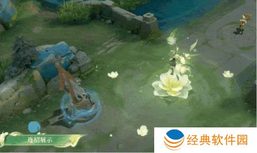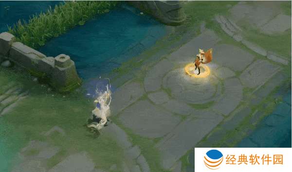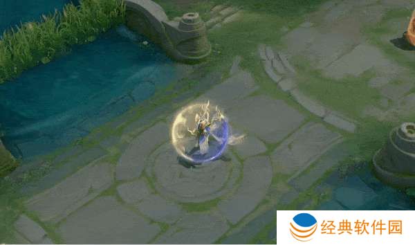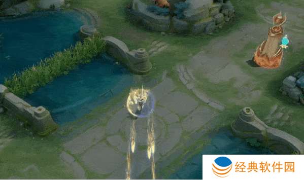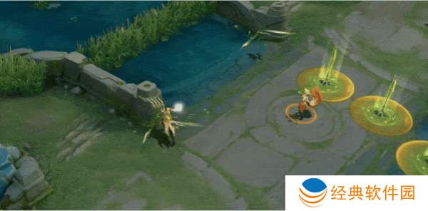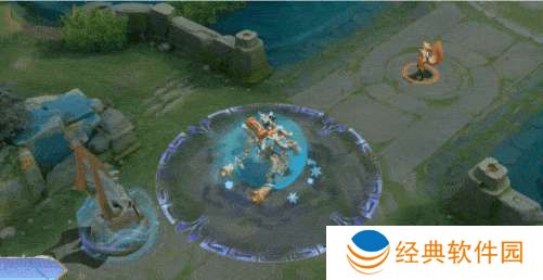 技能特效以青黄色为主,标枪在地面生成茶叶的图案,由于是勇者皮肤因此特效比较简单,不过打击感还是蛮利落的。