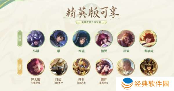 钟无艳-生化警戒、白起-白色死神、典韦-黄金武士、伽罗-花见巫女、金蝉-前尘和女娲-尼罗河女神。