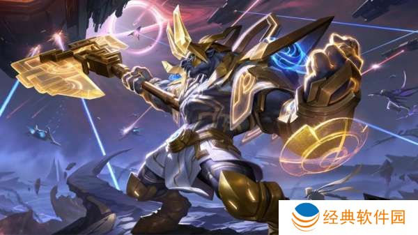 造型设计上牛魔身穿蓝金色铠甲、手握金色巨斧,技能特效融入了金色符文印记、紫色星空能量和战场废墟元素。