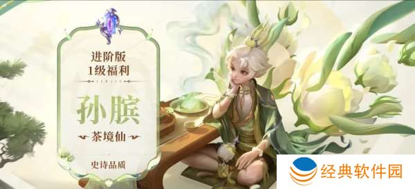 孙膑-茶境仙、品质史诗限定,进阶版战令1级获取,造型设计上孙膑身穿绿色民族服饰,背后是***朵错落排布而成的轻盈翅膀。
