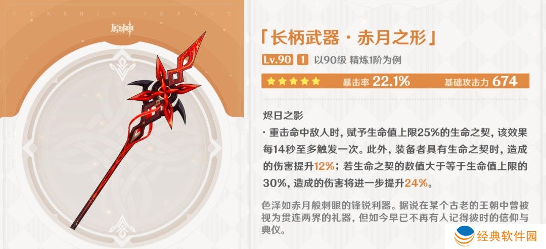 赤月之形,全新五星长柄武器。武器白字为674,副属性为22.1%暴击率。武器特效为,当重击命中敌人时,给携带者赋予生命值上限25%的生命之契,每14秒最多触发一次。当装备者具有生命之契时,造成的伤害提升12%;如果生命之契的数值大于等于生命值上限的30%,造成的伤害进一步提升24%。也就是说吃满最多可以增加36%的增伤。