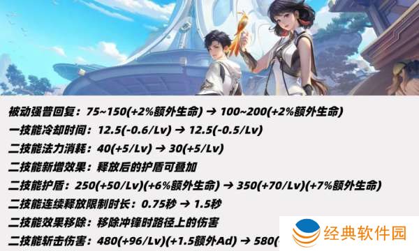 强化普攻上调25-50点回血,满级一技能增加0.5秒CD,二技能蓝量消耗减少10点。