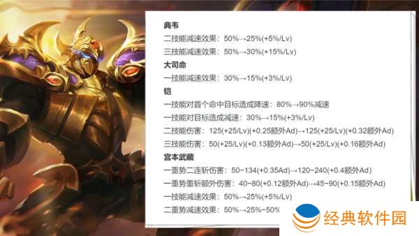 二技能减速从30%调整至15%-30%,大批量英雄减速技能削弱,马超会成为最大受益者之一。