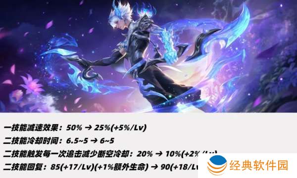 二/三技能减速从50%调整至25%-50%,一技能攻速前期提升10%、满级不变,二技能CD前期不变、满级缩短0.5秒。