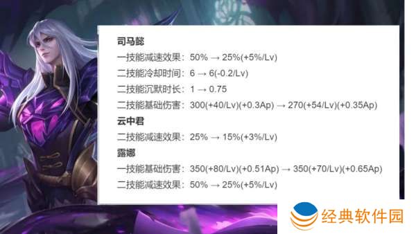 二技能冷却前期不变、满级缩短1秒。二技能下调30点伤害、上调14点等级成长和0.05AP加成。