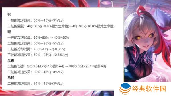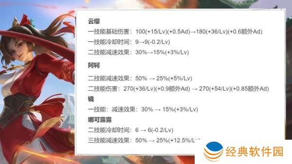 二技能减速从30%调整至15%-30%,一技能伤害上调基础数值、AD改为额外AD加成,满级一技能缩短1秒。