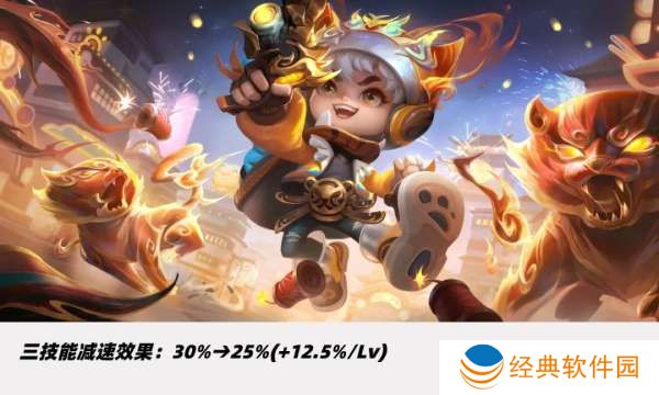 三技能减速从50%调整至25%-50%,三技能前期缩短6秒、满级不变,