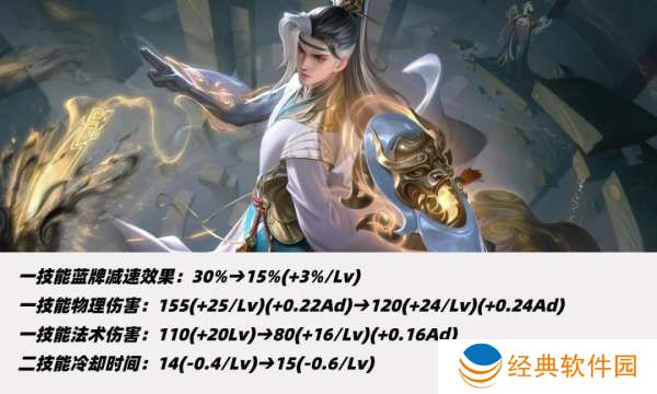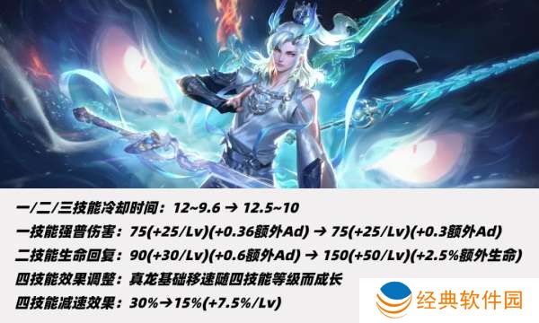 一技能下调50点基础伤害、上调14点等级成长和0.07AD加成,一技能冷却前期不变、满级缩短1秒。