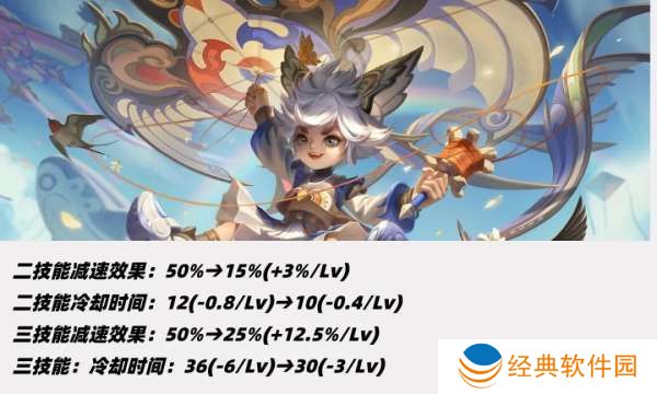 一技能蓝牌减速从30%调整至15%-30%,二技能前期增加1秒、满级不变。