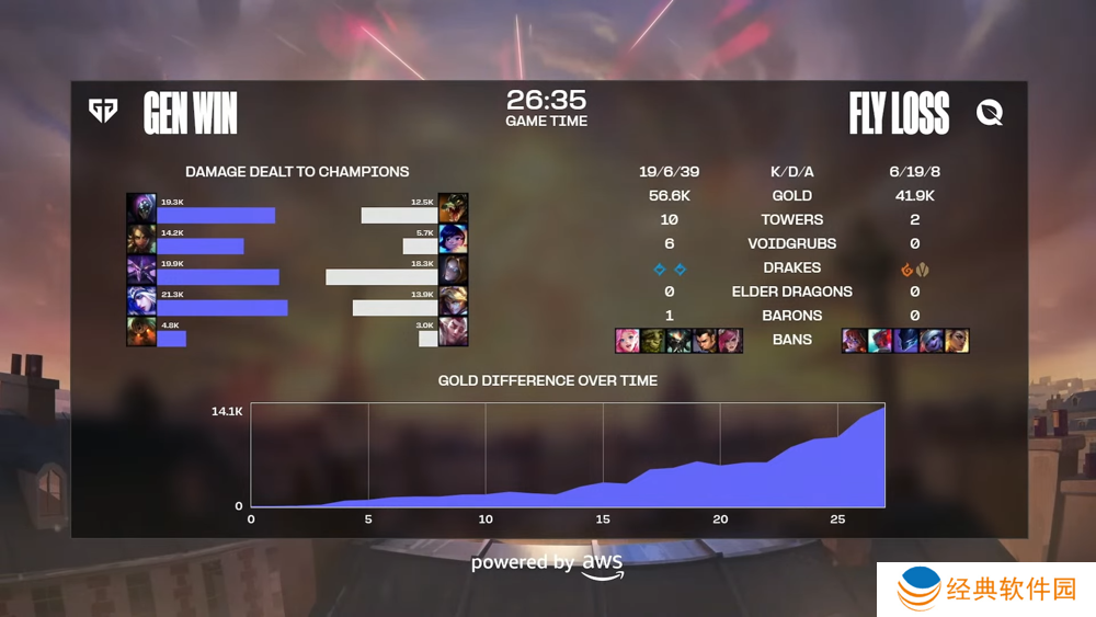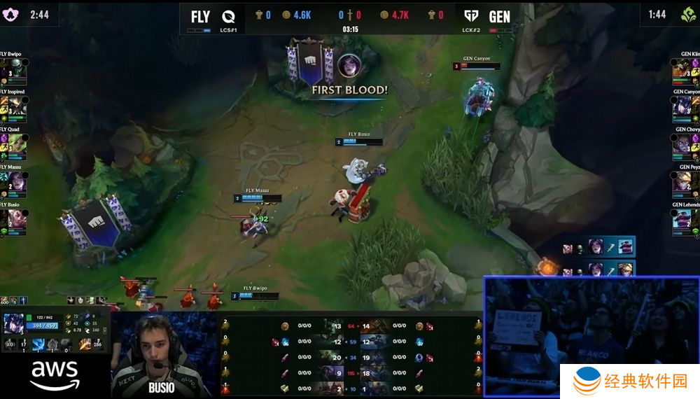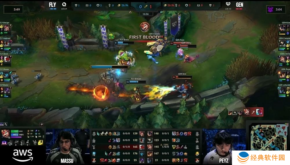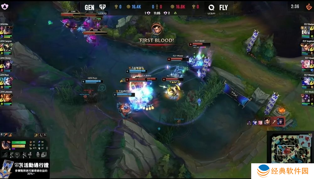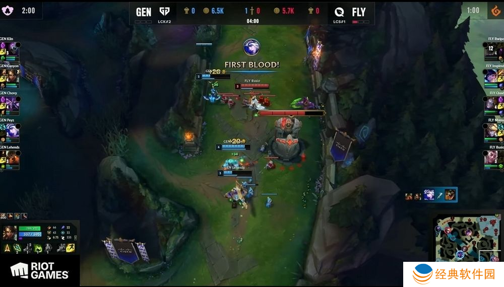第二场比赛 GEN 拿出比赛少见的卡萨丁应战,FLY 则是选出打野努努。然而前期 GEN 部属塔杀雷尼克顿成功,让贾克斯持续掌握边缐优势,尽管 FLY 积极尝试给予卡萨丁压力,但多次塔杀都因为伤害不足未果,甚至送出击杀与助攻数,让 Chovy 的卡萨丁反而快速拿到两件大装,经济更大幅领先奥莉安娜。26 分钟 GEN 就予以犟势回应,透过快速到位的调整追成 1:1。