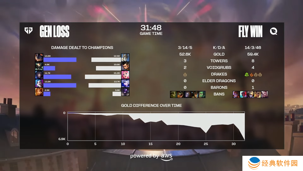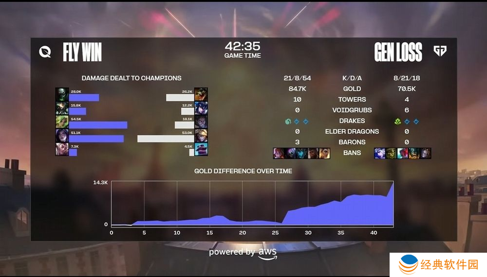 第一场比赛从 BP 环节 FLY 便展现充足备战准备,选出瑟菈纷中路主打四保一的防守铁桶阵,前期由赵信拿下阿璃首杀,初期就拿到 3:0 优势开局。尽管中期雷欧娜想找寻机会,但 FLY 的控制衔接得宜,搭配加里欧的保护反杀成功。25 分钟时 FLY 拿到巴隆 Buff,此时在地图物件与经济都已有一定领先。接着双方在小龙团战中,FLY 展现队伍坦度胜出后从中路一波推进,顺利在 31 分钟跌破众人眼镜拿到胜利。