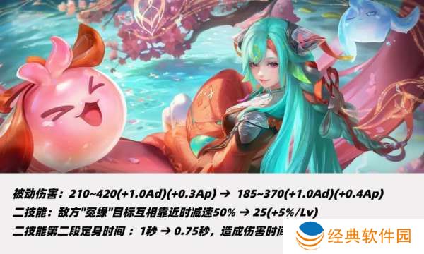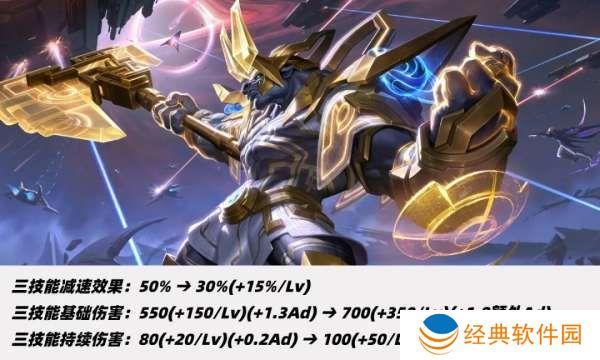 大招减速效果从50%调整至30%-60%,大招上调基础伤害和等级成长,AD加成改为额外AD加成。