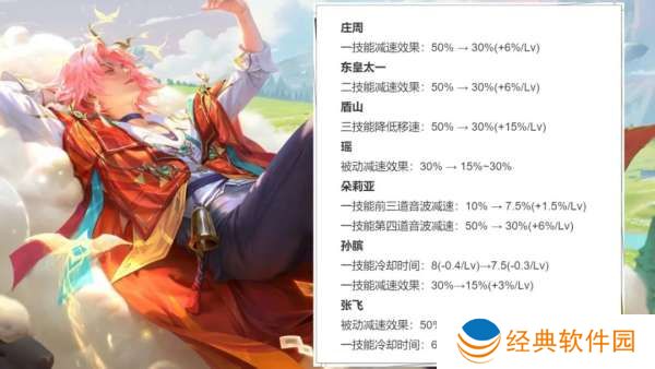 庄周一技能、东皇太一二技能和盾山三技能:减速从50%调整至30%-60%。