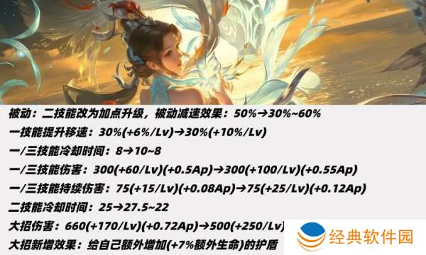 ②一三技能基础伤害上调0.05Ap加成、持续伤害上调0.04AP加成,四技能上调0.18Ap加成。