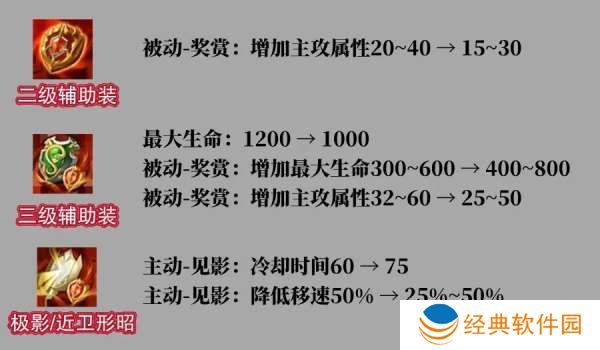 ①二级辅助装主攻属性加成:前期下调5点、满级下调10点