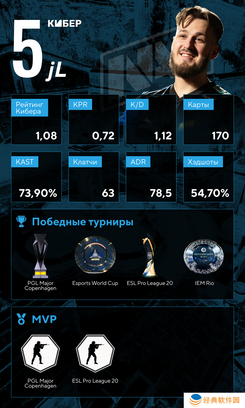 jL的排名为什么会高于其他选手呢?因为他有一个强有力的亮点——Major的MVP。在哥本哈根Major比赛中,jL几乎一人扛起了整个队伍——这不是夸张。iM在该赛事的表现非常糟糕,rating只有0.93,而jL的rating为1.17。jL在每回合击杀数方面排名第14位(0.72),总击杀数排名第9位(2466次),助攻数排名第4位(699次)。此外,jL也是一个出色的残局收割者:在2024年,他成功逆转局势51次,排在全世界第五。BLAST 世界总决赛和上海Major的失利严重影响了jL的统计数据,而他几乎整个赛季的表现都非常稳定。