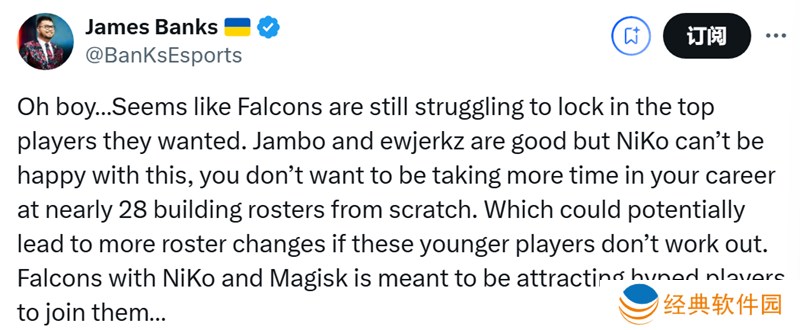 “看来Falcons仍在艰难地争取锁定心仪的顶级选手。Jambo和ewjerkz表现不错,但NiKo对此恐怕不会满意。年近28岁,没人想在职业生涯中再花时间从头组建阵容。要是这些年轻选手表现不佳,很可能会导致阵容进一步变动。Falcons有NiKo和Magisk,本应能吸引备受瞩目的选手加入…… ”