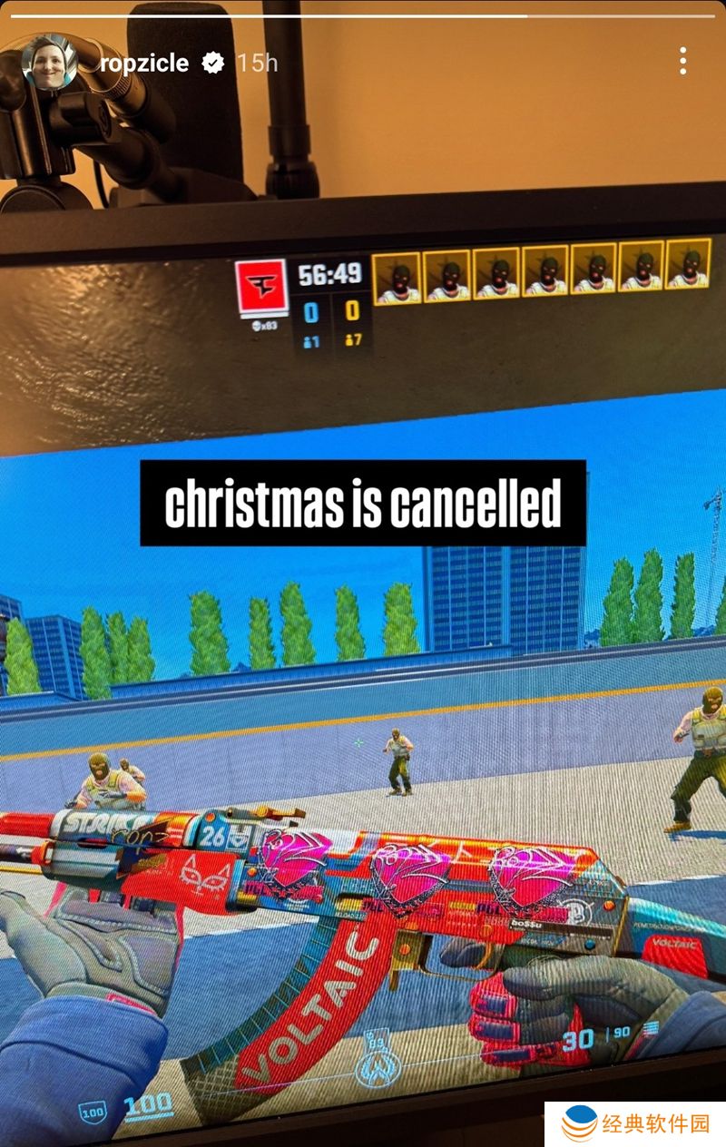 FaZe战队选手ropz在社交频道中发布动态,内容是他手持贴有自己印花的AK47在练枪地图中的画面,同时ropz也写道:圣诞节取消。