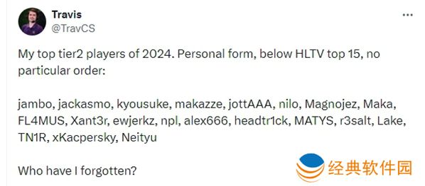 “我心目中的2024年二线选手名单。根据个人表现,队伍HLTV排名在15名之外,以下排名不分先后顺序。”