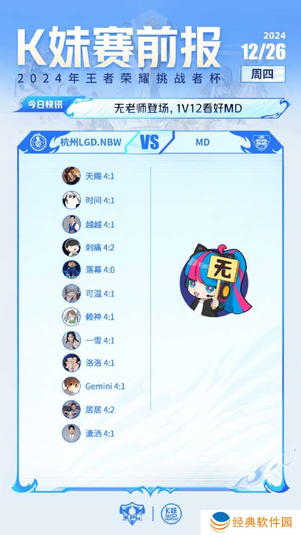 LGDNBW对战MD :无老师首战登场,1v12看好MD;