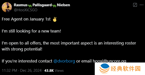 “从明年1月1日开始成为自由选手,我仍在寻找新队伍!我对所有的工作都持开放态度,最重要的是队伍的阵容有趣且潜力强大!”