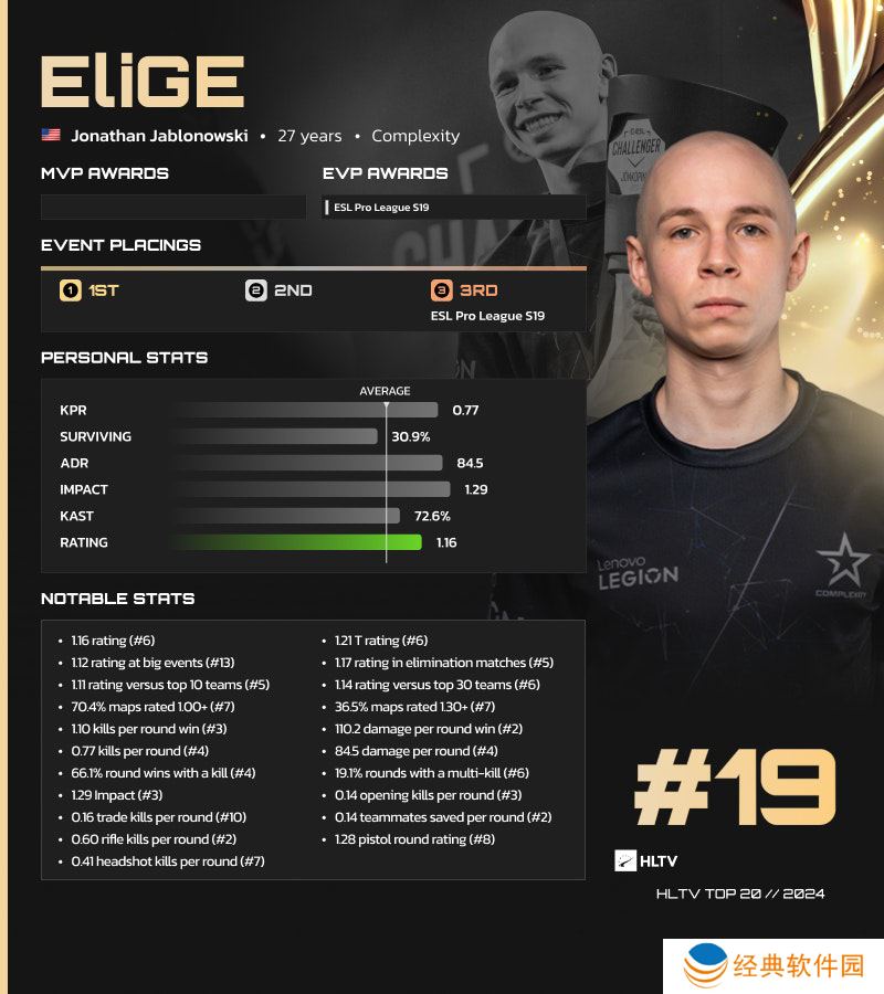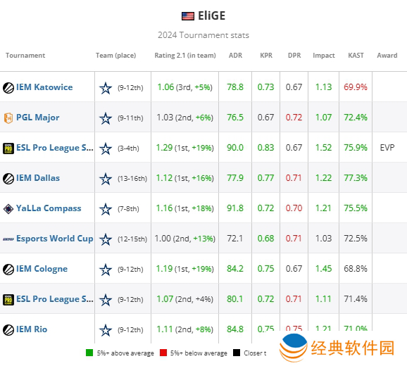 EliGE凭借今年出色的数据表现跻身2024年最佳选手的榜单。他的数据甚至连TOP20中的大多数选手都望尘莫及,例如1.16 Rating(TOP6)、1.12的大赛Rating(TOP13)、0.77 KPR(TOP4)、84.5 ADR(TOP4)、1.09 胜局KPR(1.09)、110.2 ADR(TOP2)。