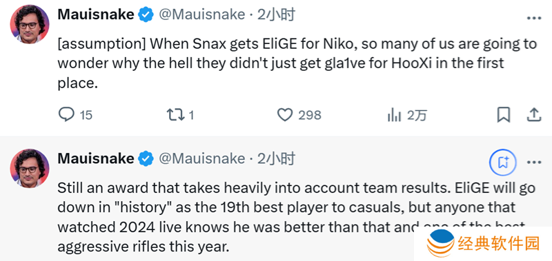 分析师Mauisnake:这仍然是一个在很大程度上考量团队成绩的奖项。在普通观众眼中,EliGE会以年度第19位最佳选手的身份“载入史册”,但任何观看了2024年赛事直播的人都知道,他的表现远不止于此,他是今年最出色的侵略型步枪手之一。