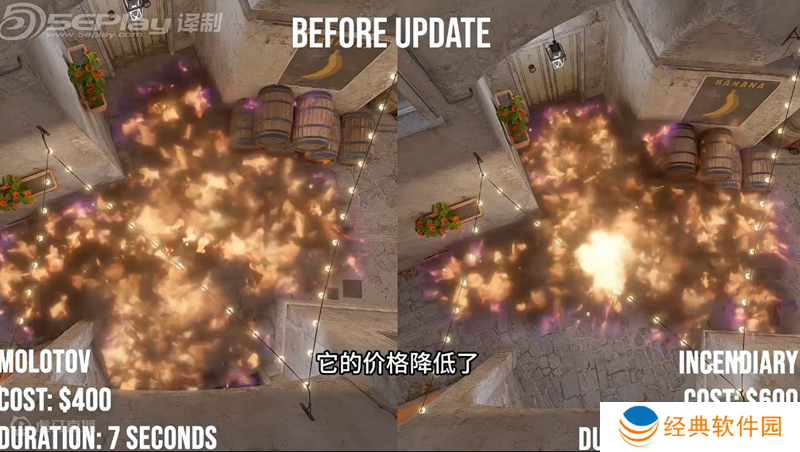 今年五月底的更新中,开发人员将安装炸弹但被拆除时进攻方队伍奖励从800美元降至600美元,以减少第一回合对后续回合的影响。同时将M4A4的价格从3100美元降至3000美元。防守方燃烧弹的价格从600美元降至500美元,但缩短了燃烧持续时间、缩小了火焰蔓延的覆盖面积。