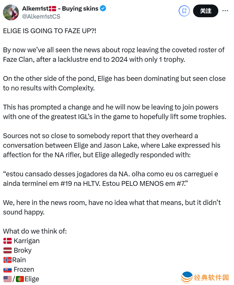 今天爆料人Alkem1st在社交平台上透露,EliGE有可能会加盟FaZe战队。