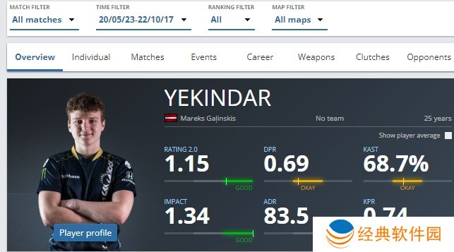 Outsiders时期),他能贡献平均1.15 rating,总击杀数6997,总阵亡数6587,K/D差+410。在352张地图上他的每回合击杀为0.74,1+rating的占比是69.9%。