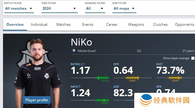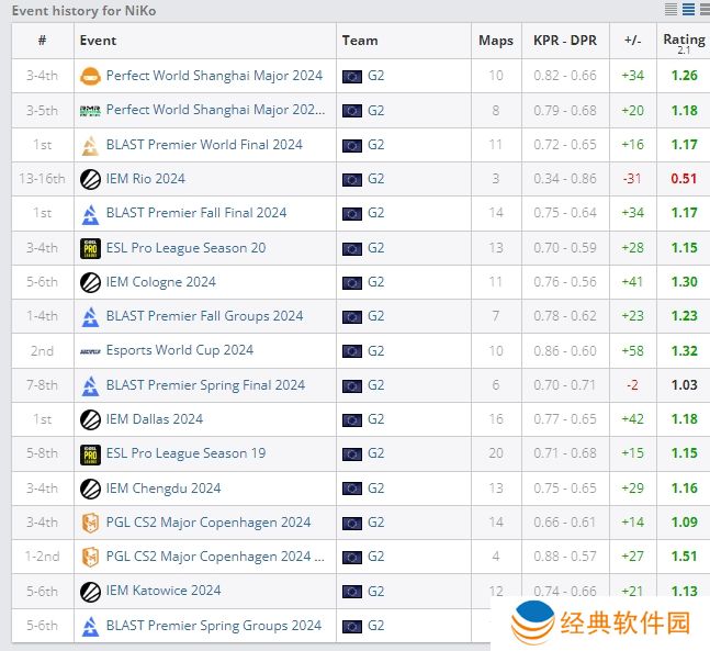 今年NiKo随G2获得了IEM 达拉斯、BLAST Premier秋决、BLAST Premier世界总决赛3个冠军。在这3个夺冠的赛事,MVP获得者都是他的队友m0NESY,NiKo在2024年获得了6个EVP提名(IEM 成都、IEM 达拉斯、电竞世界杯2024、BLAST 秋决、BLAST 世界总决赛和刚结束不久的上海Major)。他个人在2024年打出了平均1.17 rating。在183张地图上拥有0.74的每回合击杀,1+rating的占比达到69.4%。