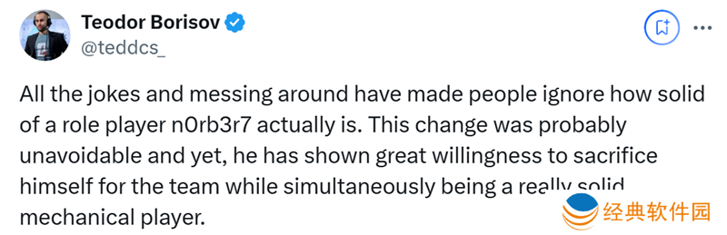 Tedd:所有的玩笑和调侃,都让人们忽视了n0rb3r7实际上是一名多么稳健的角色选手。这次人员变动或许不可避免,然而他不仅展现出了为团队甘愿自我牺牲的精神,同时还是一名实力强劲的枪男。