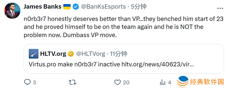 “说实话,n0rb3r7理应得到比VP更好的待遇……2023年初他们就把他下放替补席,后来他又证明了自己能重回战队,而现在问题根本不在他身上。VP这步棋真的太蠢了。 ”