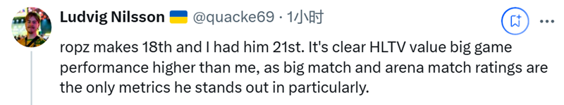 而在社交平台上有CSer质疑ropz排名有些高,HLTV编辑NER0给出了回复。