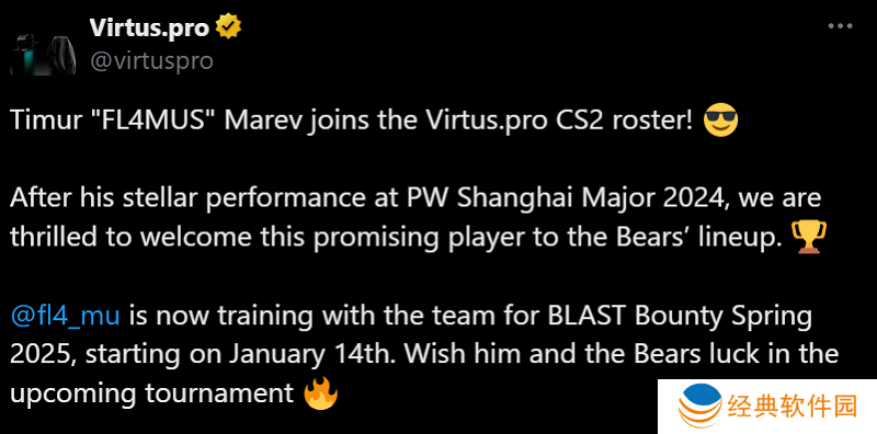 FL4MUS目前正在与团队一起训练,为2025年1月14日开始的春季BLAST赏金赛做准备。祝他和“白熊”在接下来的比赛中好运。”