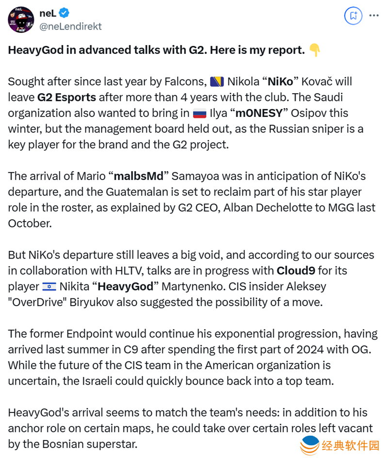 然而NiKo的离开仍留下了巨大空缺。据我们与HLTV合作获取的消息源称,G2正在与Cloud9就其旗下以色列选手HeavyGod的转会进行谈判。独联体地区的爆料人OverDrive也暗示了这一转会的可能性。