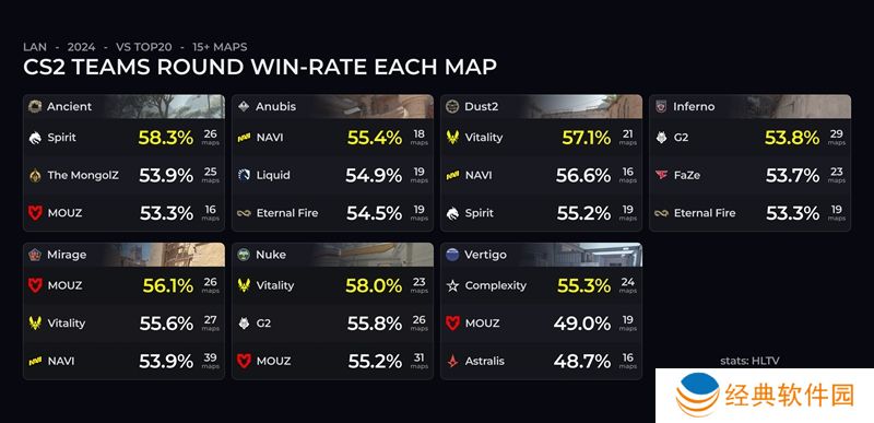 日前,外媒数据统计博主在社交平台上分享了2024年在各地图上回合胜率最高的队伍(数据来源HLTV)