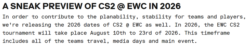 电竞世界杯主办方已经公布了2026年CS新版本赛事的时间。