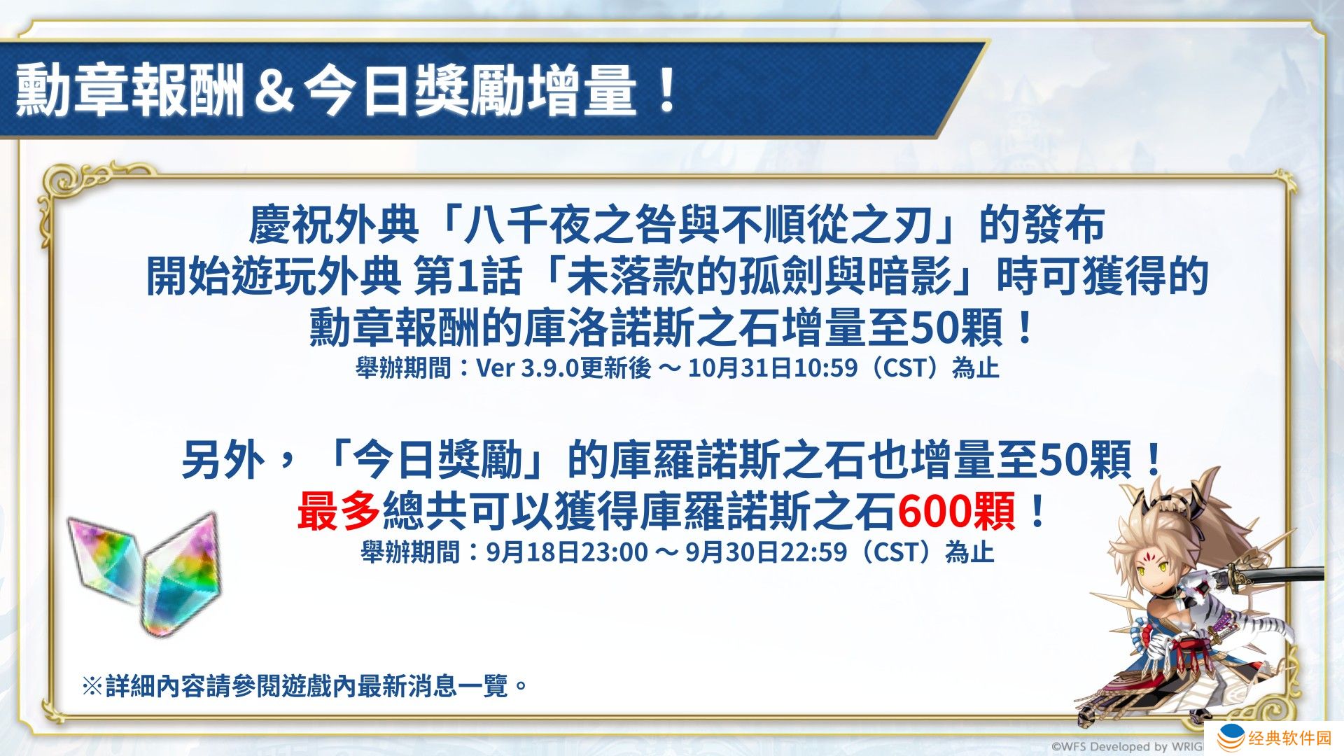 庆祝外典「八千夜之咎与不顺从之刃」的发布,举办开始游玩外典第 1 话时可获得的勋章报酬的库罗诺斯之石增量至 50 颗的活动。另外,「今日奖励」的库罗诺斯之石也增量至 50 颗。最多总共可以获得库罗诺斯之石 600 颗!