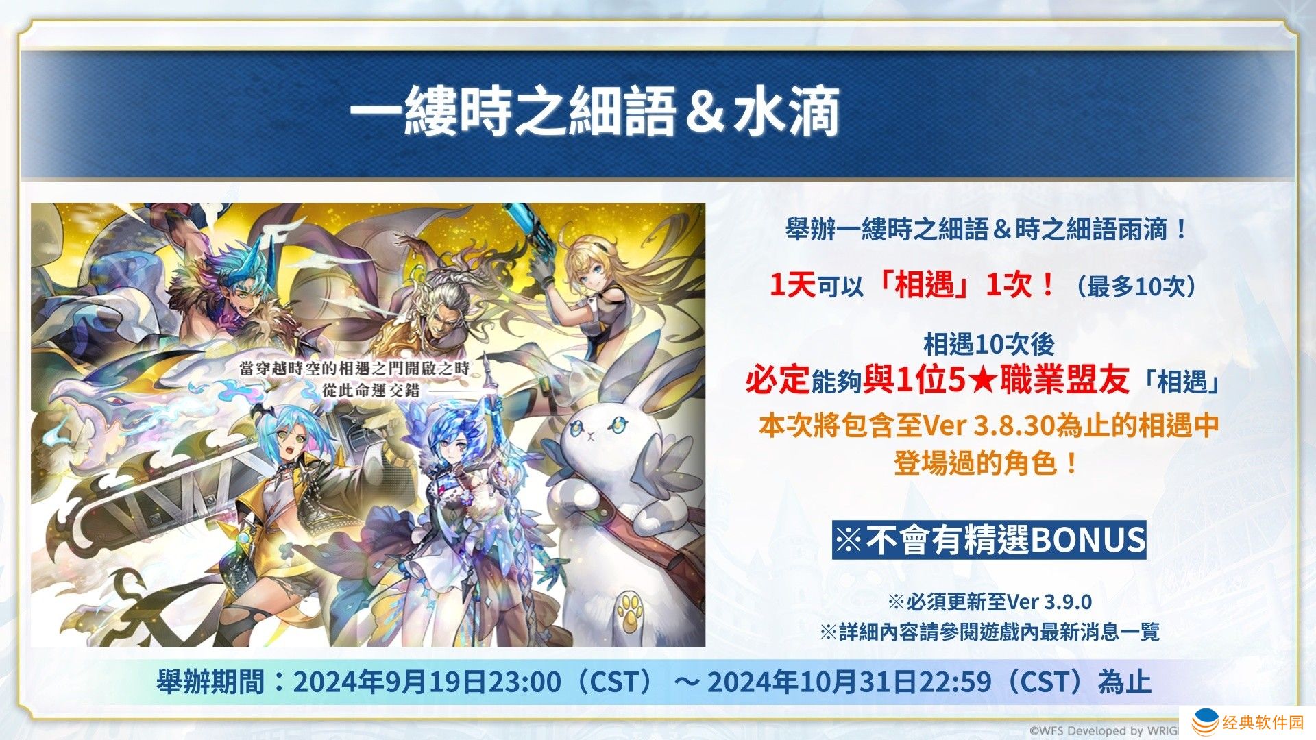 另外,Ver 3.9.0 更新后将会举办 1 天可以免费进行 1 次相遇,相遇 10 次后必定能够与 1 位 5★职业盟友相遇的「一缕时之细语」+「时之细语雨滴」,还有活动期间内的今日奖励将增量至 50 颗,最多总共可以获得库罗诺斯之石 600 颗的活动。