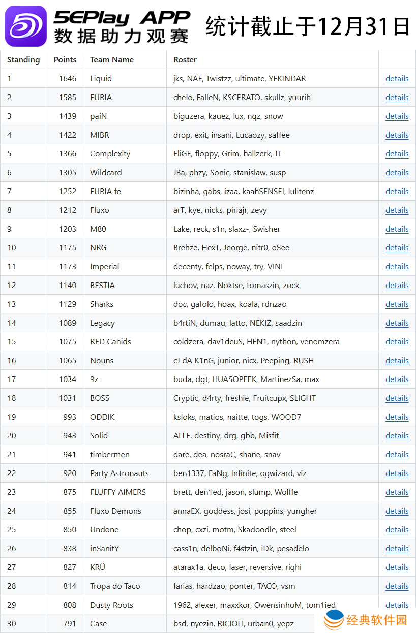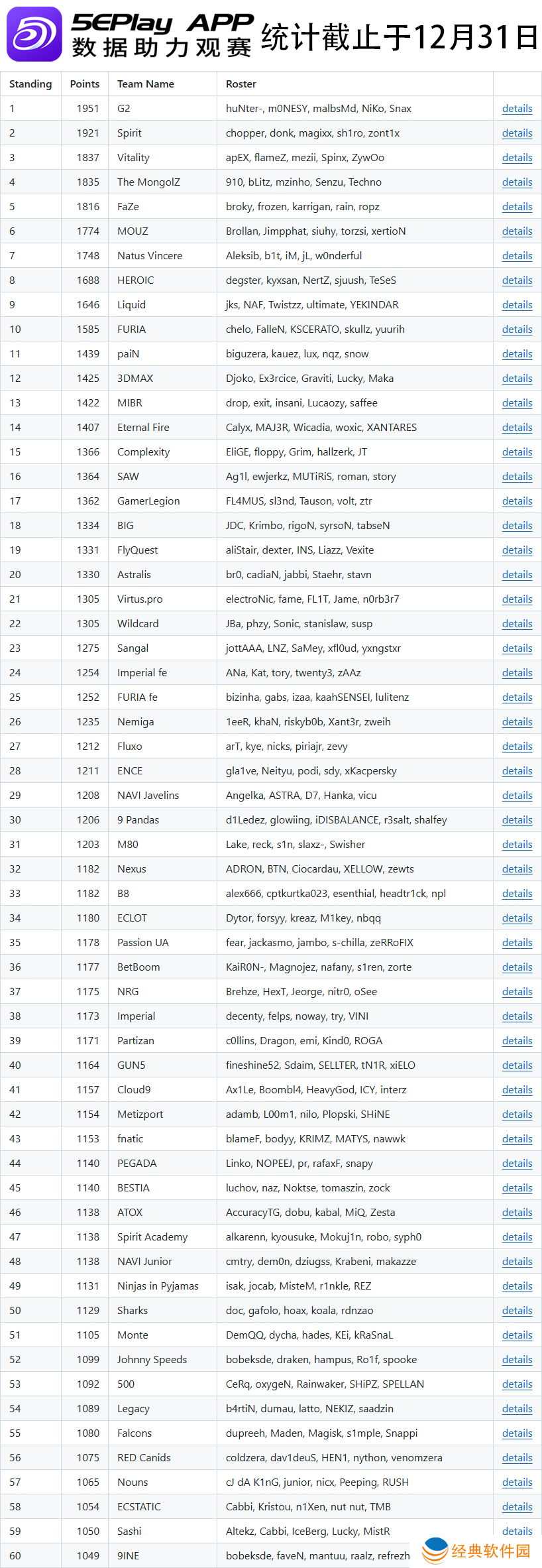 昨日V社更新了旗下CS世界排名,这一世界排名即是2024年各队伍的最终积分,也是新一年每支队伍的起始积分。由于近期处于冬季转会期,部分队伍的排名将会在之后迎来较大变动。