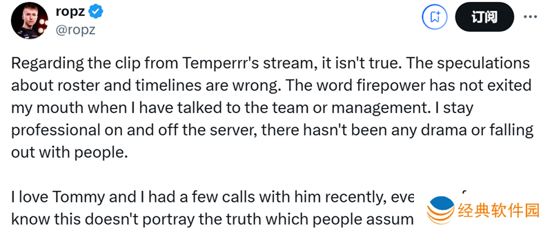 “关于Temperrr直播中的那段视频内容,那不是真的。有关阵容和时间线的猜测都是错误的。我在与战队或管理层交流时,从未说过‘火力’这个词。无论在游戏内还是现实生活中,我都保持专业态度,并没有和任何人发生过矛盾或不愉快。