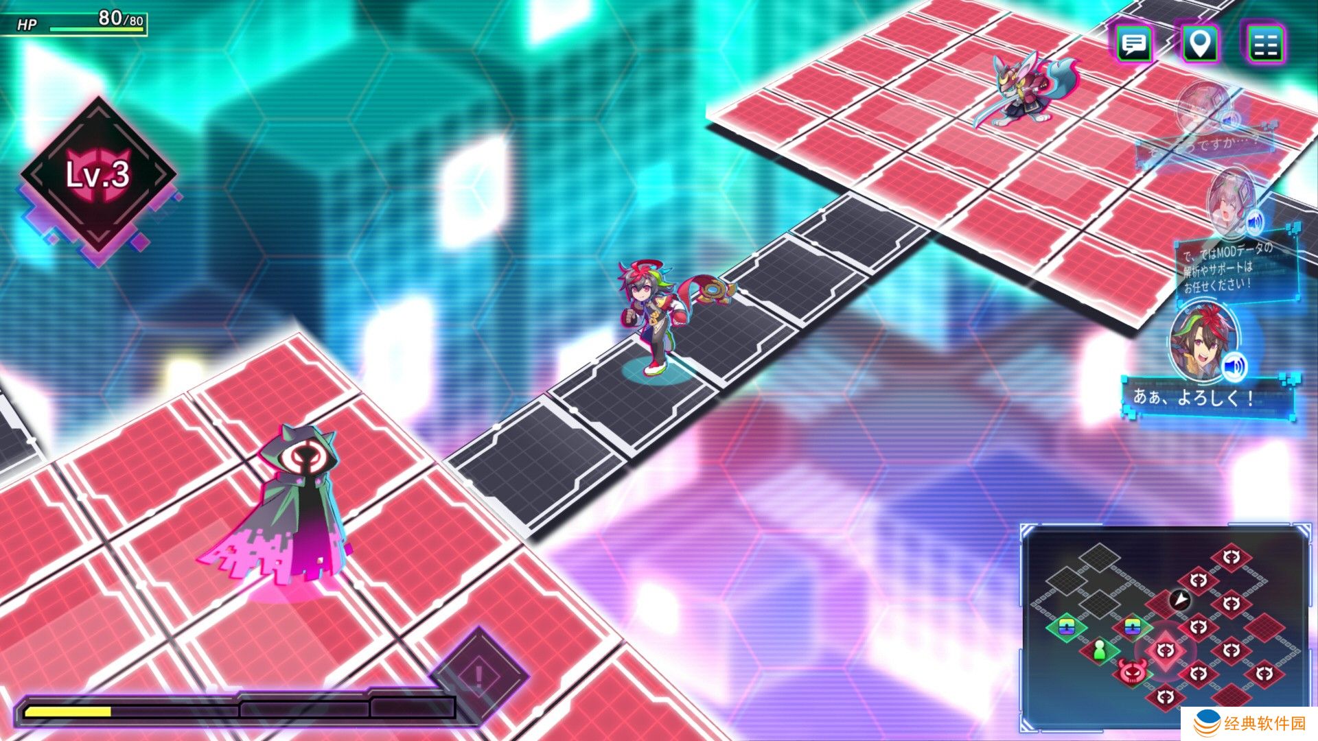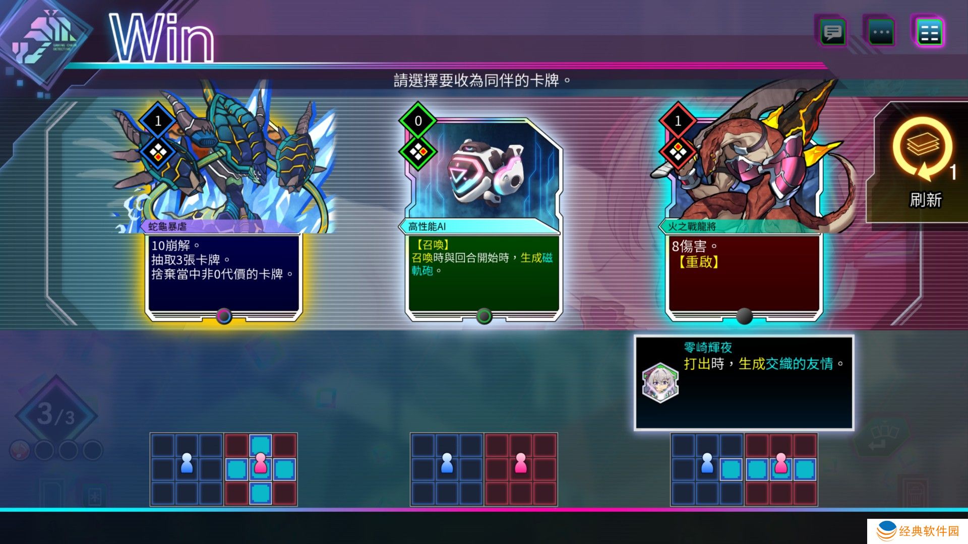 霓虹要探索电脑世界中的迷宫,并在每次战斗胜利时选择要招为新同伴的卡牌,藉此犟化牌组,挑战身为各款游戏男女主角的头目。