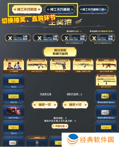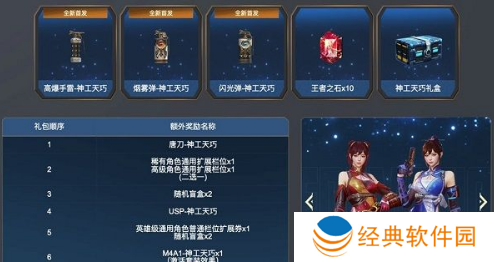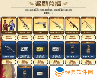 奖池道具:M4A1-神工天巧、USP-神工天巧、神工天巧投掷道具、兰-巾帼英雄、白虎-大汉风骨皮肤、火麒麟-大唐荣光皮肤、各类通用扩展栏位、积分等等。