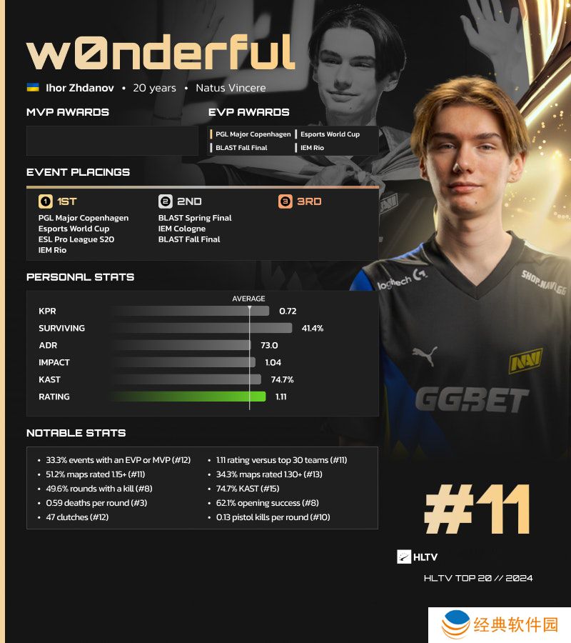 w0nderful在Natus Vincere令人印象深刻的2024年中获得四项EVP,首次跻身TOP20选手榜单。
