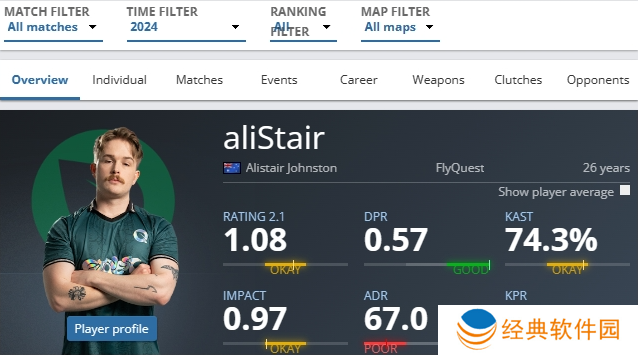 aliStair在2024年的赛事平均rating是1.08。