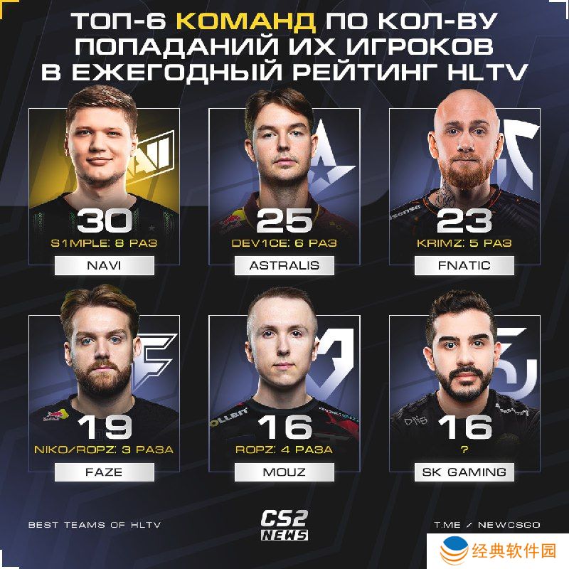 根据俄罗斯媒体统计,历史上旗下选手入选TOP20次数最多的俱乐部为NAVI(30次),紧随其后的是