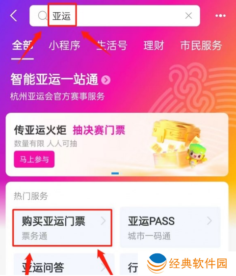 1. 上支付宝搜【亚运】,在智能亚运—站通小程序购票;
