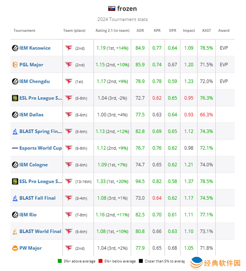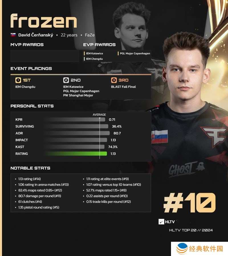 frozen连续第三次跻身TOP20榜单,因为他在参加的每项赛事中都表现出了无与伦比的水平,获得多个EVP称号,每次平均Rating都在1.00或更高。