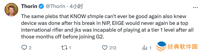 “那些知道s1mple再也无法回归巅峰的人同时也知道,device在NIP休息后就会结束职业生涯了,EliGE再也无法成为世界顶级步枪手了。而jks在经历了加入G2之前的几个月休息期后也无法再打出一线水平了。 ”
